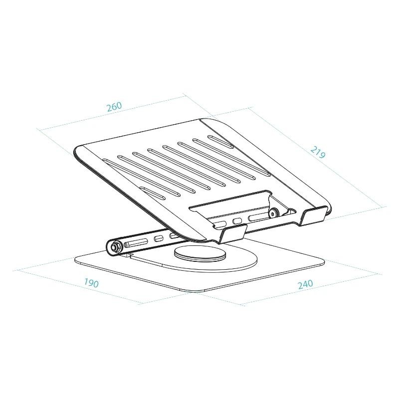 | Características | - Diseño con rotación de 360° - Ángulo de visión ajustable - Plegable y portátil - Diseño abierto que mejora el flujo de aire - Estable y antideslizante - Almohadillas de silicona antideslizantes - Válido para dispositivos de 11”-17” - Peso máximo soportado 5 kg - Material: fabricado en acero de carbono Dimensiones y peso - Medidas del producto: 260 x 220 x 50 mm (plegado 260 x 220 x 130 mm (desplegado) - Peso: 1,762 kg |
