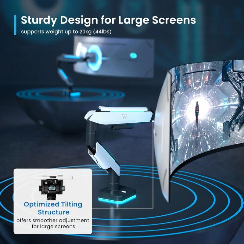 | Características | - Material: aluminio, acero, plástico - Acabado superficial: Recubrimiento en polvo - Color: negro mate y gris blanquecino - Instalación: Abrazadera, Montaje en escritorio - Tamaño de pantalla sugerido: 17"-49" - Adecuado para: 1 pantalla - Monitor plano con capacidad de peso: hasta 20 kg - Capacidad de peso Monitor curvo: hasta 20 kg - VESA: 100x100,75x75 - Puntos de pivote: 3 - Inclinación: +50°~-20° - Giratorio: +90°~-90° - Girar: 360° - Extensión del brazo: 458 mm - Grosor de la abrazadera: 10 mm-85 mm. - Altura ajustable libremente: Sí (resorte de gas) - Efecto de luz RGB - Gestión de cables Dimensiones 138 x 553 x 659 mm |