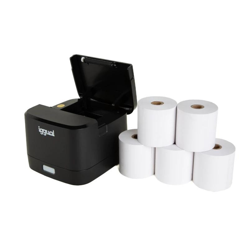 Rendimiento y practicidad se unen en este pack de iggual, que combina la impresora térmica TP EASY 58 con 5 rollos de papel térmico 100 % libres de bisfenol A. Una solución lista para funcionar desde el primer momento, pensada para entornos de venta que valoran la eficiencia, la fiabilidad y el ahorro.