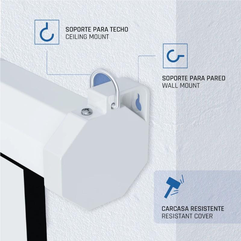 | Características | - Formato 16:9. - Área visible de 106" (234 x 131 cm) - Bordes negros de 4 cm - Carcasa blanca y a prueba de polvo - Apto para pared y techo - Parte trasera en negro para mayor refracción de la luz - Muy buena planeidad y tensión gracias al grosor de la tela - Voltaje 230 VAC- Frecuencia 50Hz - Salida del cable de alimentación por el lado izquierdo visto desde frente de la pantalla - Incluye control de pared y mando remoto infrarrojo (IR) - Factor de ganancia de 1.2, ideal para cine en casa y presentaciones - La caída de la pantalla puede ser frenada en cualquier punto, por lo que se puede ajustar la longitud de la pantalla a cualquier formato - La barra inferior queda al ras con la carcasa - Ideal para cualquier tipo de proyector, SVGA, XGA, 3D, HD, Full HD y 4K - Dimensiones del cajetín: 262.5 x 10 x 10 cm |