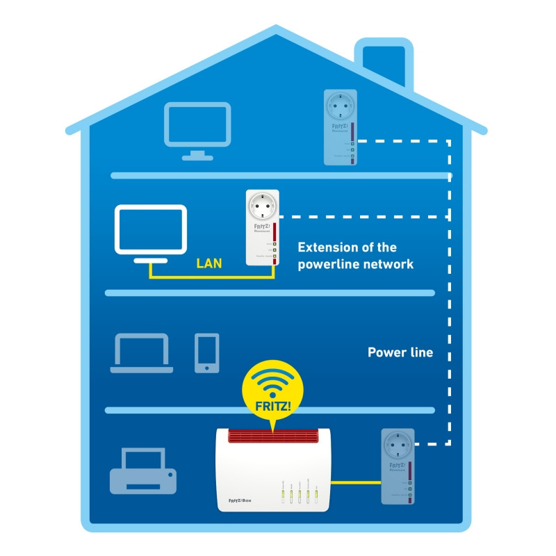 ¿Para qué necesita cableado si puede enviar los datos a través de la red eléctrica? El FRITZ!Powerline 1220E convierte cada una de las tomas de corriente de su hogar en una autopista de datos: con velocidades de hasta 1.200 Mbps, los paquetes de datos más pesados viajan a toda velocidad y con la máxima seguridad a través de la red doméstica